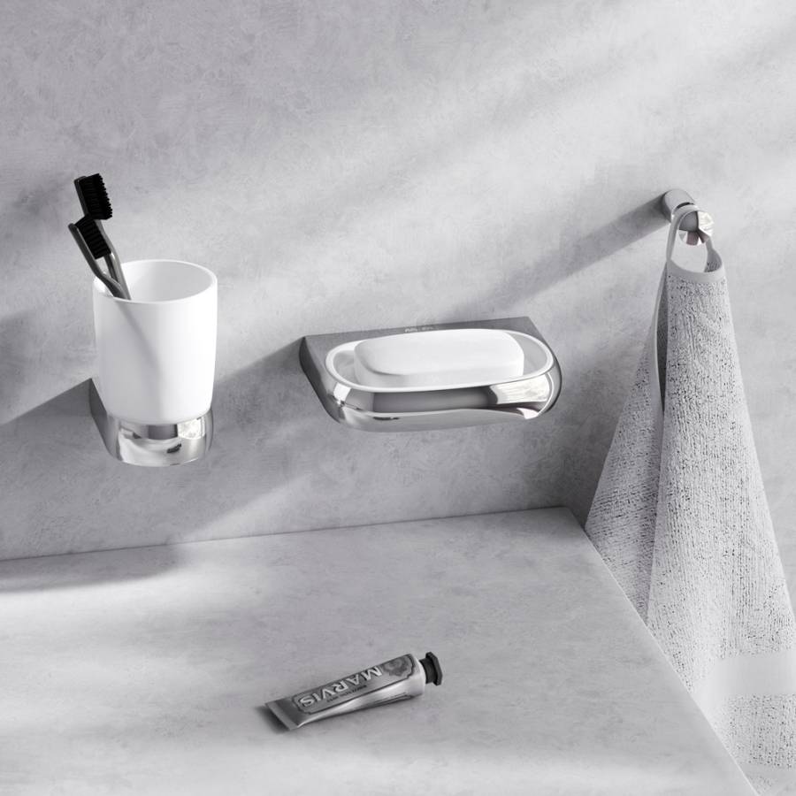 Занимая минимум места в пространстве аксессуары Sensation помогут рационально организовать место для хранения и станут стильными акцентами в интерьере. В комплекте: стеклянная мыльница стеклянный стакан крючок для полотенец._x000D_