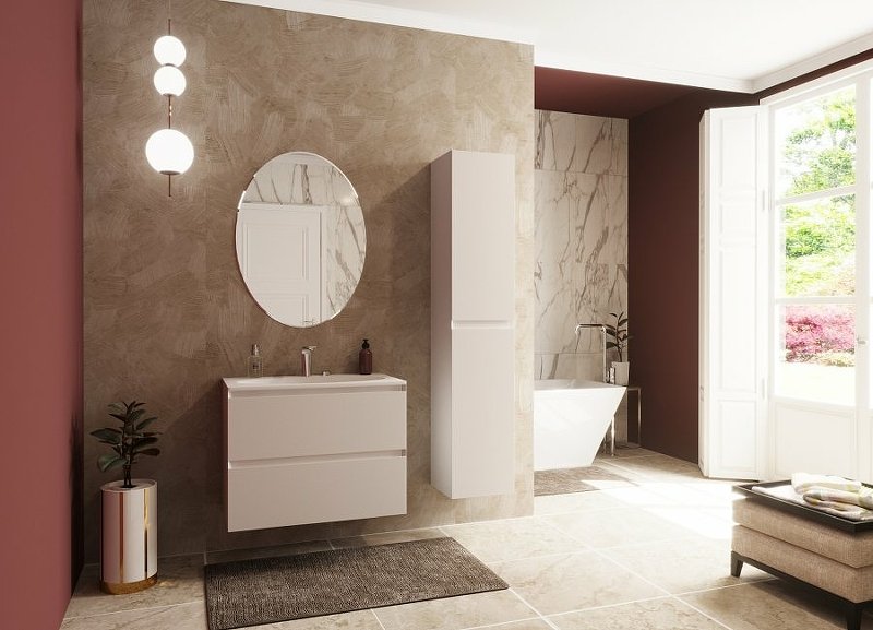Подвесная тумба укомплектована прямоугольной раковиной из литьевого мрамора, плавно перетекающая в овальную чашу, которая добавляет изящность мебели и передает атмосферу стиля. В тумбе расположены 2 вместительных ящика, интегрированные ручки выполнены за счет скошенных фасадов. Мебель выполнена из влагостойкого ЛДСП и качественного MDF с использованием эмали RENNER (Италия). Ящики снабжены системой плавного закрывания. Для мебели используется фурнитура BLUM (Австрия).