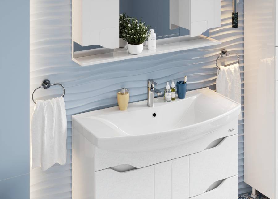 Четыре вместительных выдвижных ящика, снабженные направляющими полного выдвижения, помогут организовать пространство в ванной комнате и компактно разместить необходимые вещи, а распашная дверь посередине, украшенная фрезеровкой и оснащенная системой открывания push-to-open, скрывает дополнительное место для хранения.