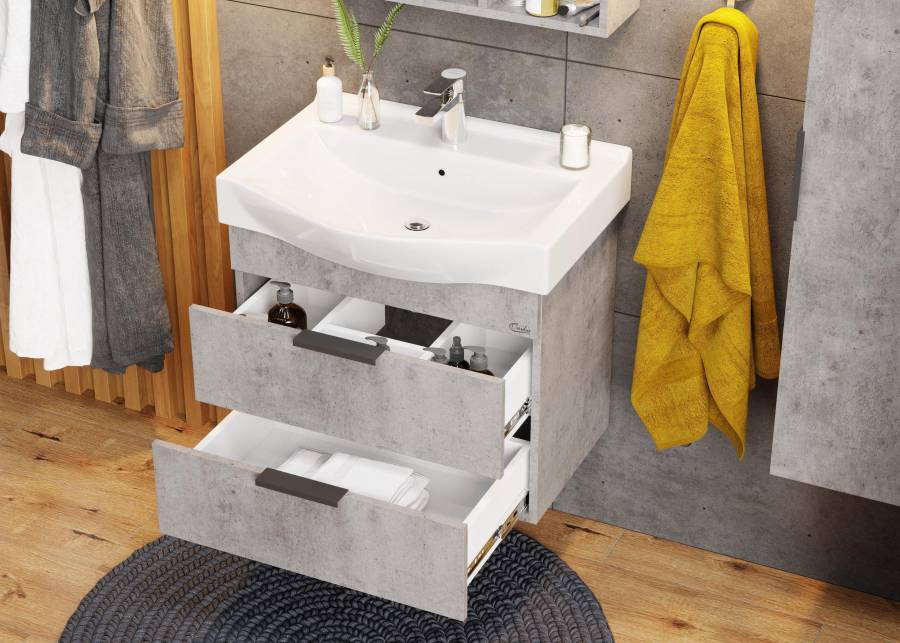 Тумба имеет два ящика с направляющими скрытого монтажа с доводчиками, оснащенные черными матовыми металлическими ручками. Нижний предназначен для больших предметов, а верхний, имеющий удобную систему организации пространства, - для мелких аксессуаров.