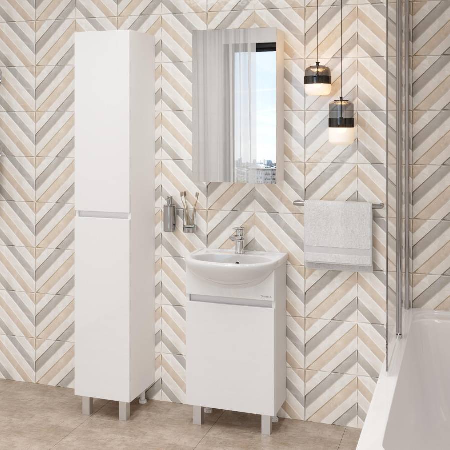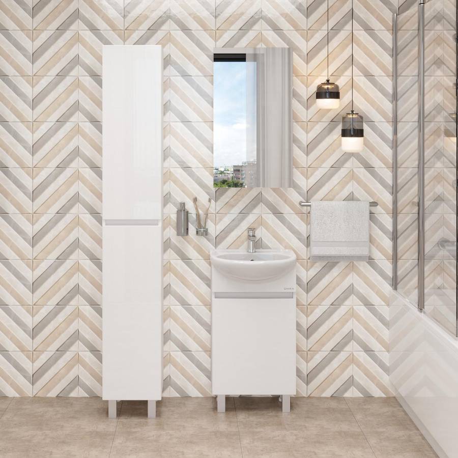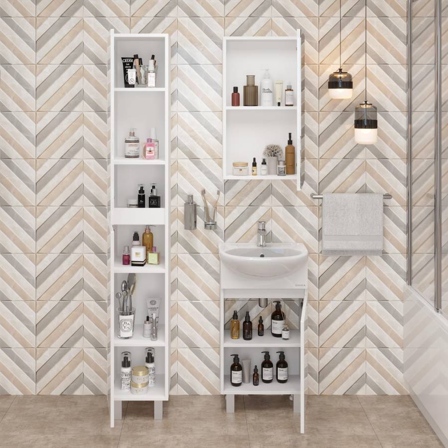 Тумба имеет белый глянцевый фасад и строгие формы без декора. За дверцей с интегрированной ручкой скрывается пространство с полкой для размещения необходимых бытовых принадлежностей.
