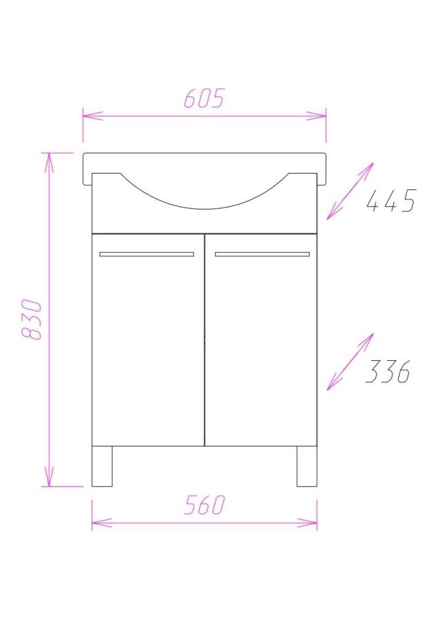 Размеры тумбы без учета раковины и ножек 56x34x68 cм.