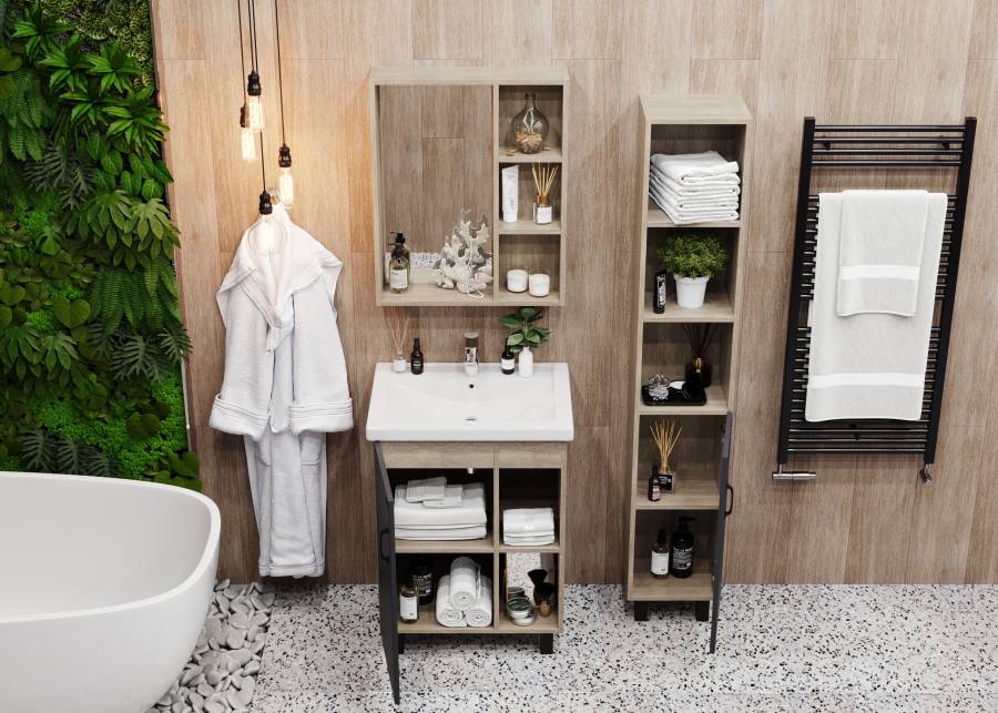 Открытые полки справа обеспечивают быстрый доступ к часто используемым аксессуарам, а пространство за распашной дверцей слева, снабженной системой плавного закрывания, станет удобным местом для хранения различных бытовых принадлежностей.