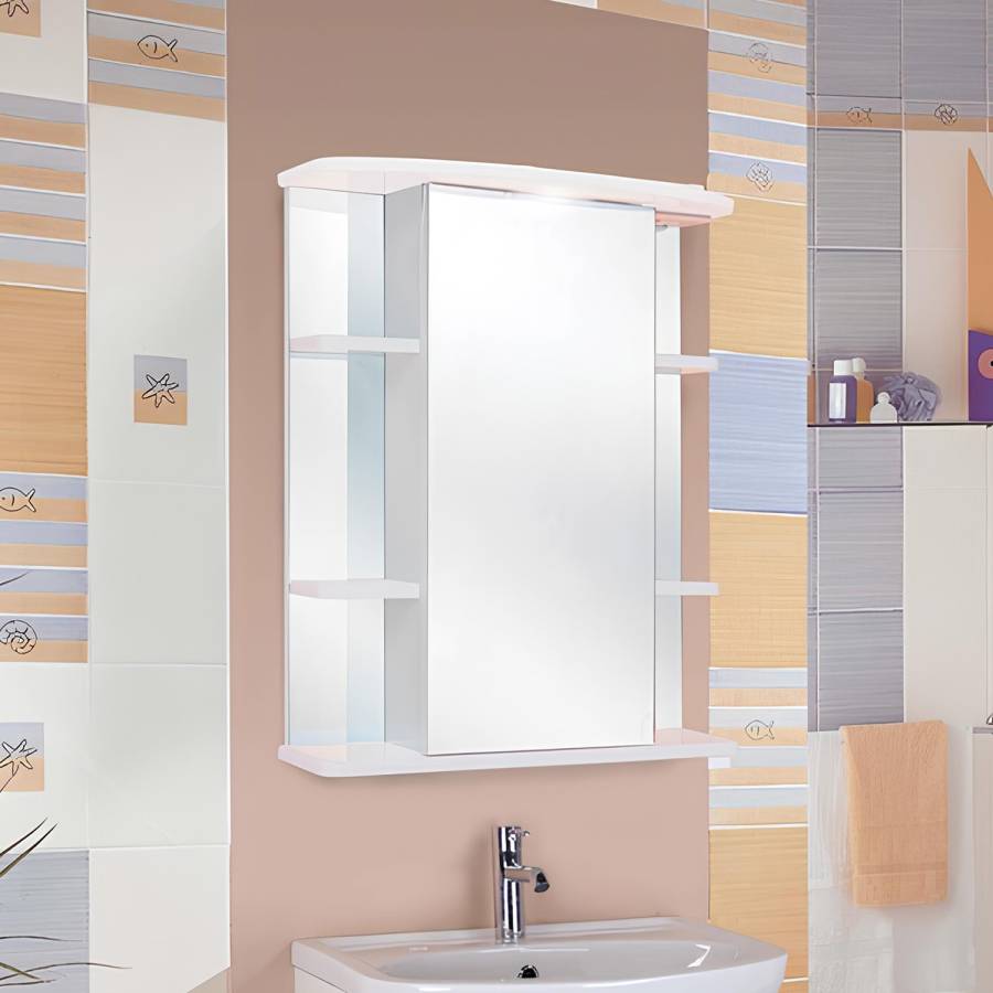 В центре шкафа - зеркальная дверца с механизмом плавного закрывания, за которой скрывается отделение для хранения, разделенное на две части горизонтальной полочкой. По бокам - открытые полочки для косметических средств или декоративных элементов.
