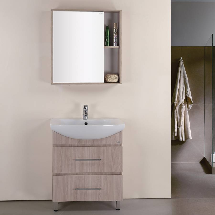 Шкаф максимально удобен в использовании: пространство за зеркальной дверцей с механизмом плавного закрывания, разделенное двумя горизонтальными полочками, позволяет компактно разместить бытовые принадлежности. 2 открытые полочки созданы специально для хранения часто используемых вещей.