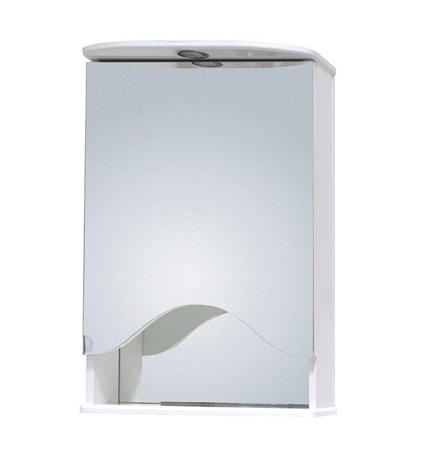 Распашной зеркальный фасад с механизмом плавного закрывания скрывает отделение для хранения, разделенное двумя полочками, под дверцей - открытая полка для косметических средств или декоративных элементов.