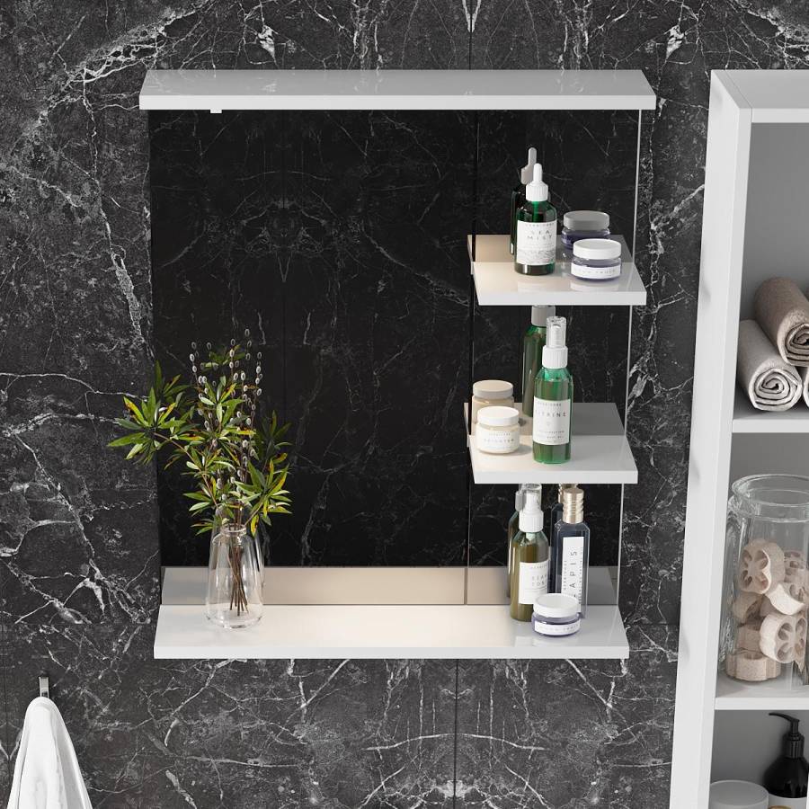 Полка под зеркалом, имеющая удобный вырез, и две небольшие полочки справа могут быть использованы для размещения декора или часто используемых предметов.