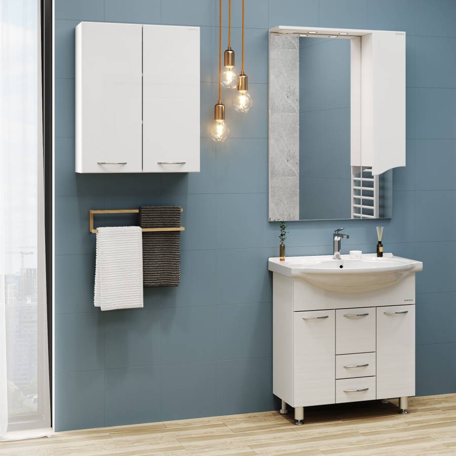 Корпус шкафа влагостойкий, выполнен из ЛДСП, фасад - из МДФ в пленке, устойчивых к механическим воздействиям, перепадам температур и высокой влажности.