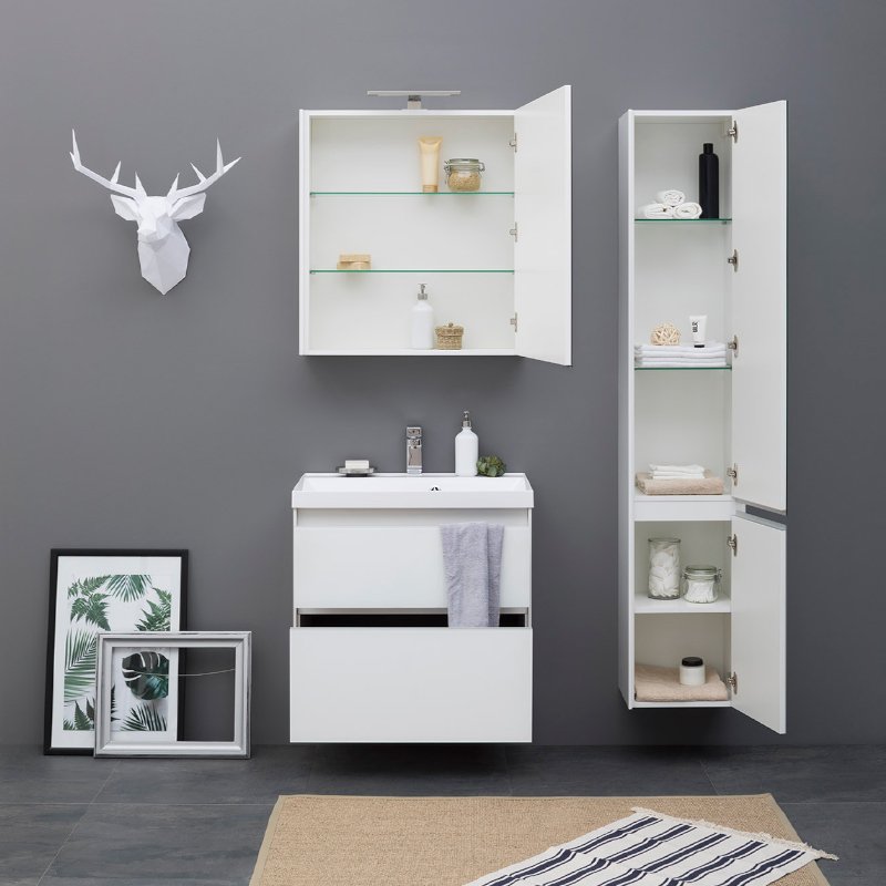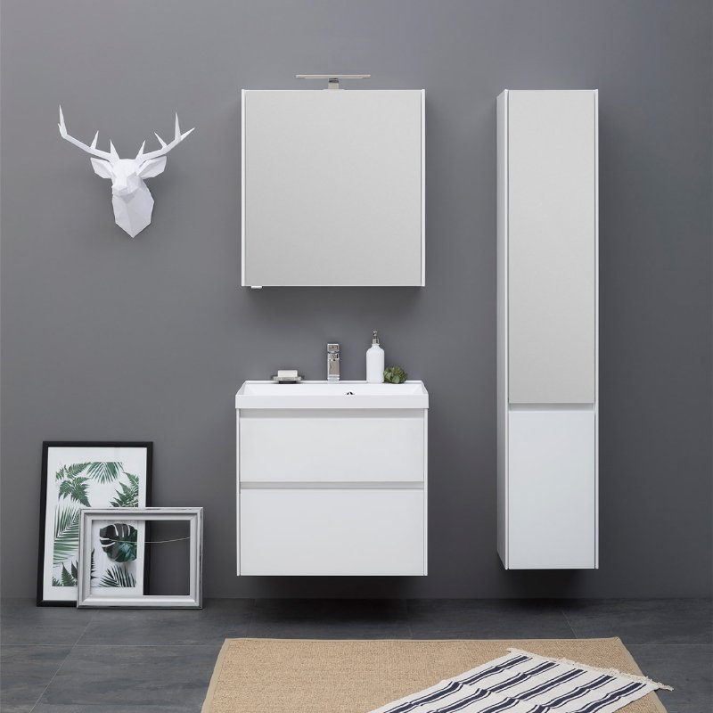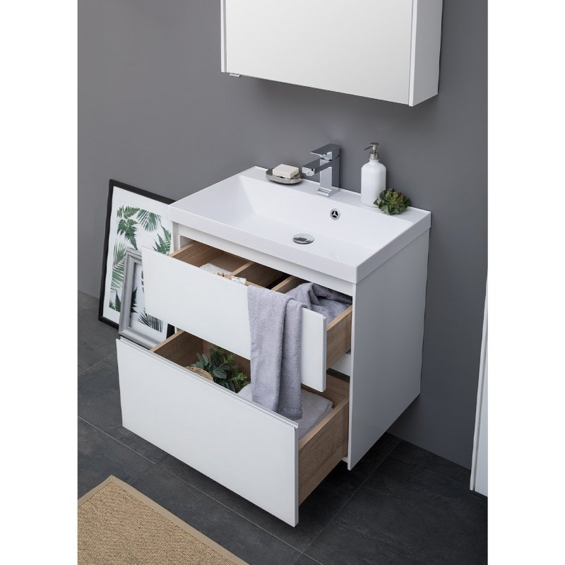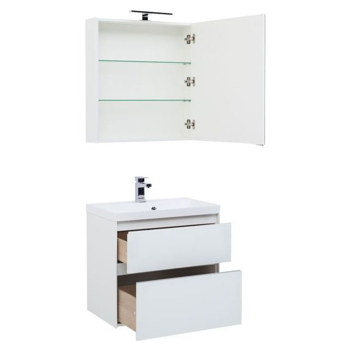 Производители позаботились о деталях. Ящики лишены выступающих деталей, ручки интегрированы в фасад. Тумбу можно из подвесного элемента преобразовать в напольный, просто докупив универсальные ножки. Раковина из литьевого мрамора «Орлеан» относится к числу накладных моделей и внешне выглядит как единое целое с тумбой. Ящики тумб оснащены направляющими Hettich Quadro c плавным закрыванием, более известным нам как доводчик.