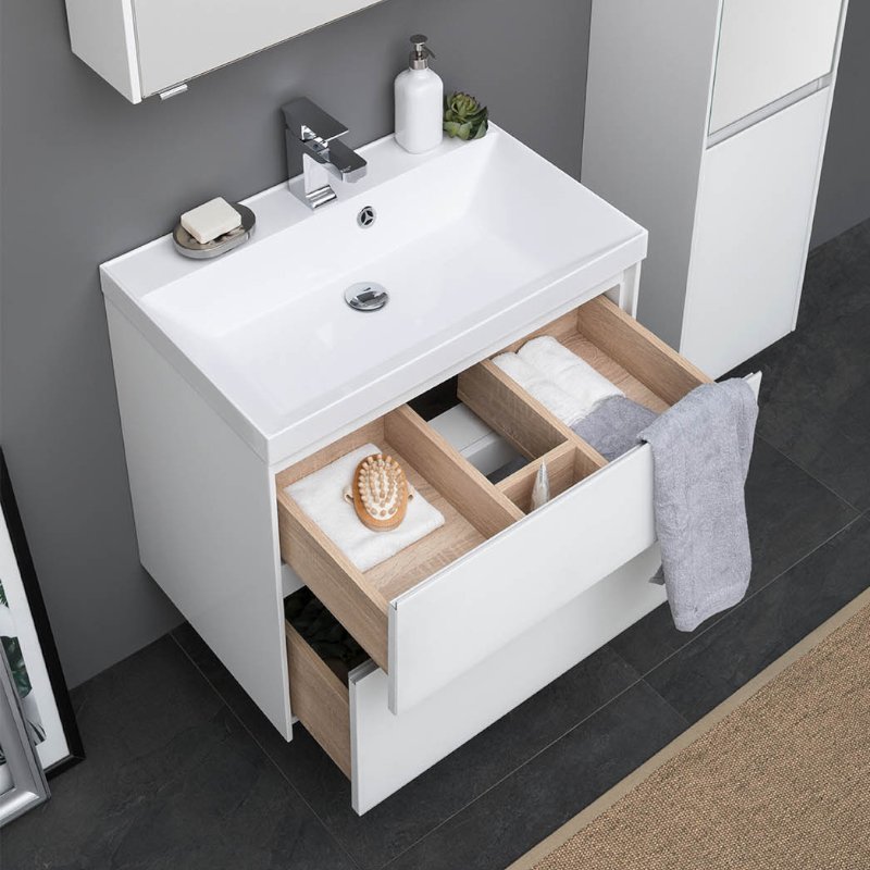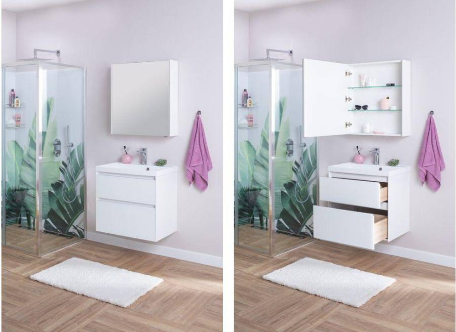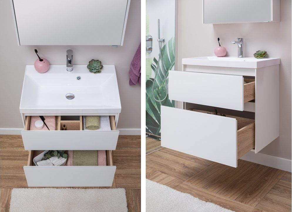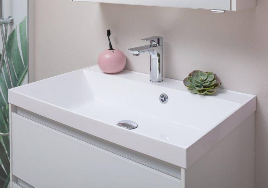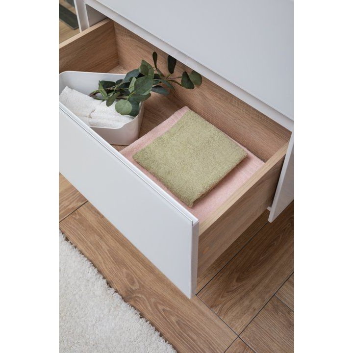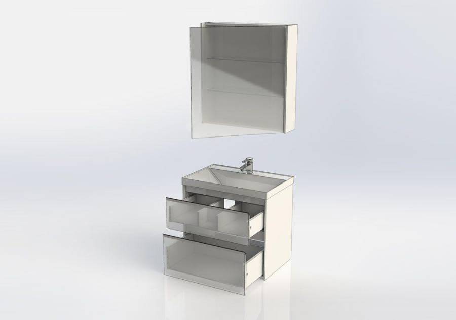 Производители позаботились о деталях. Ящики лишены выступающих деталей, ручки интегрированы в фасад. Тумбу можно из подвесного элемента преобразовать в напольный, просто докупив универсальные ножки. Раковина из литьевого мрамора «Орлеан» относится к числу накладных моделей и внешне выглядит как единое целое с тумбой. Ящики тумб оснащены направляющими Hettich Quadro c плавным закрыванием, более известным нам как доводчик.
