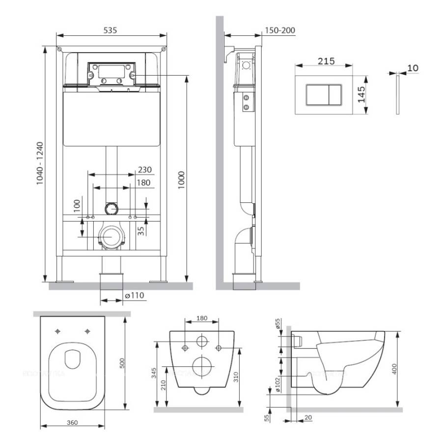 Сиденье, Звукоизолирующая прокладка, Инсталляция, Кнопка смыва, Комплект креплений, Смывной бачок |