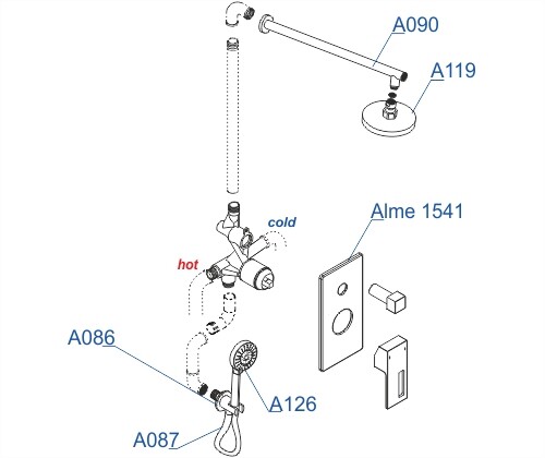 Смеситель для ванны и душа Alme 1541, Подключение шланга A086, Шланг для душа 1500 мм А087, Верхняя душевая насадка A119, Верхний излив для душа A090, Лейка 3-функциональная A126 |