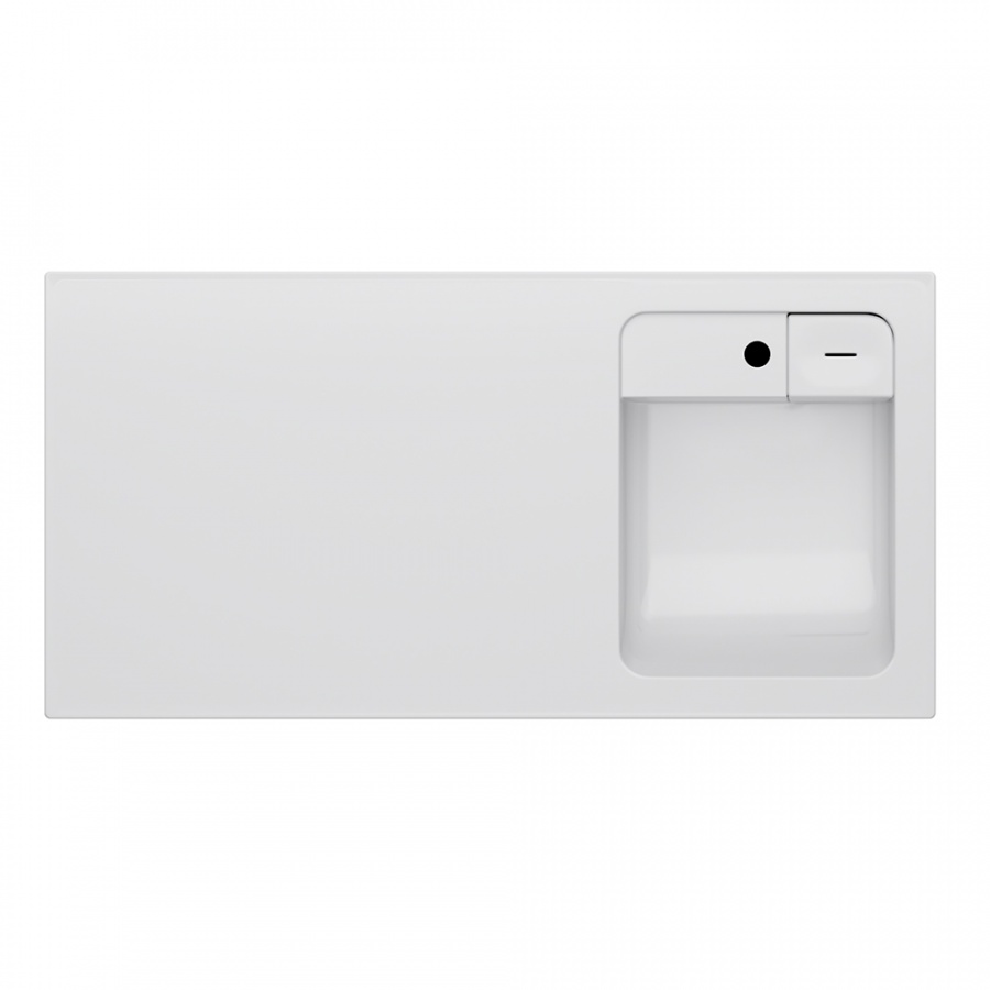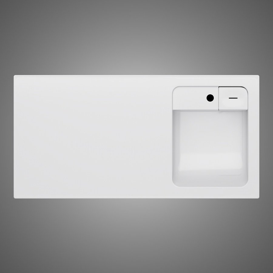 Дизайнерская раковина из литьевого мрамора белоснежного цвета с бортиком скрытым сливом и съемной мыльницей. Раковина оснащена просторной столешницей на которой можно разместить косметические и гигиенические средства. Столешница защищает стиральную машину от повреждений и механических воздействий.