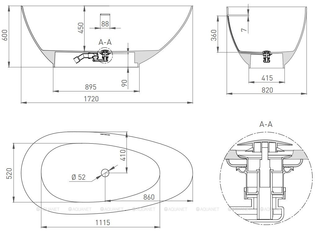 Слив-перелив интегрированный, донный клапан "Up&Down", его цвет на выбор белый, хром, золото, бронза. Требуется подиум или углубление в полу |