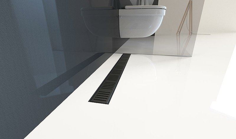 Гидрозатвор – комбинированный SMART; Перфорированная решетка из нержавеющей стали Simple 10 матового цвета в охранной пленке; Самоклеящиеся гидроизоляционные ленты; Водоотводящий желоб |