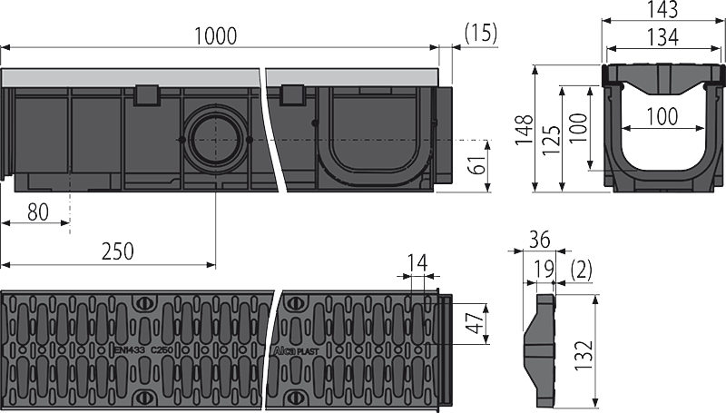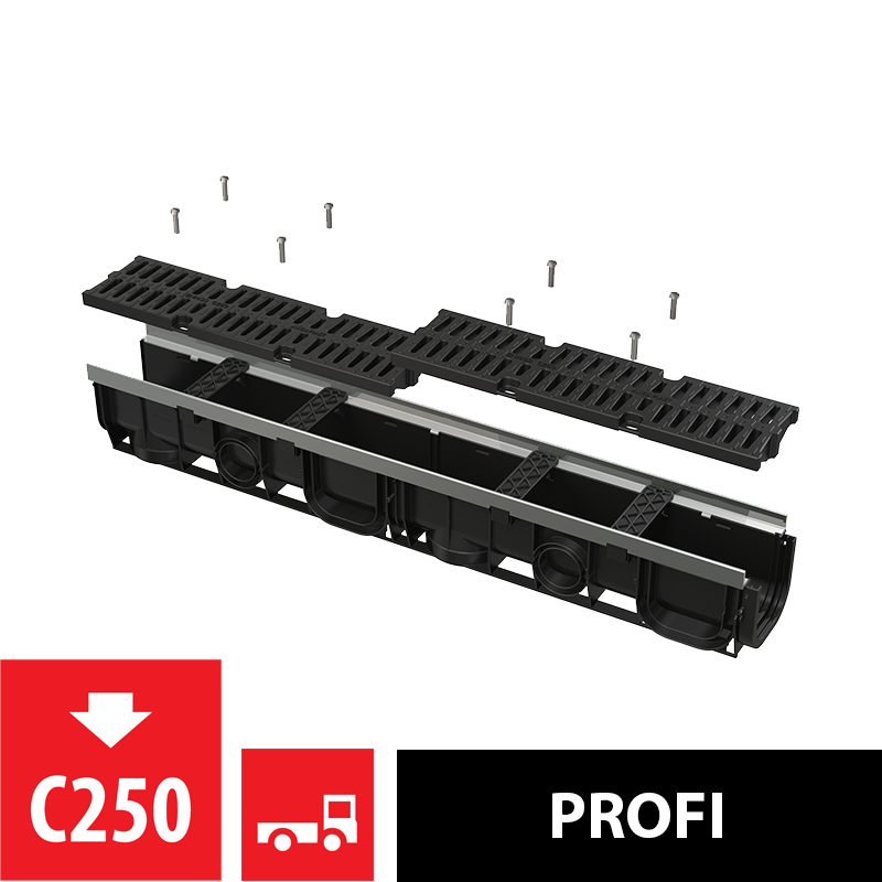Корпус желоба с металлической рамой Установочные распорки – 4 шт. Композитная решетка – 2×0,5 м – класс нагрузки C250 Болты для крепления решетки в канале – 8 шт. |