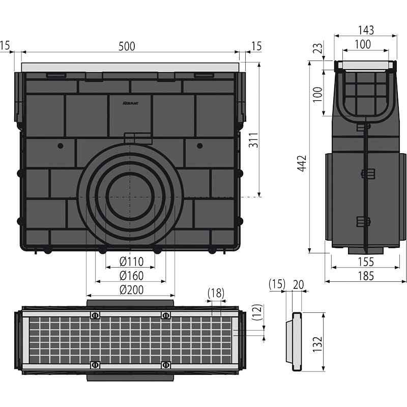 Оцинкованная перфорированная решетка – фиксация в корпусе канала с помощью четырех болтов из нержавеющей стали, размер сливных ячеек 12×18 мм