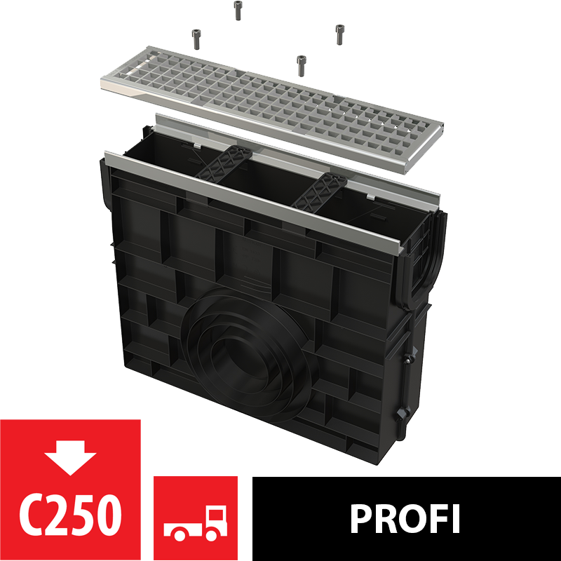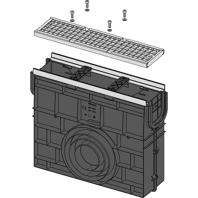 Корпус дренажного канала Оцинкованная решетка – класс нагрузки C250 Болты для крепления решетки в канале – 4 шт. |