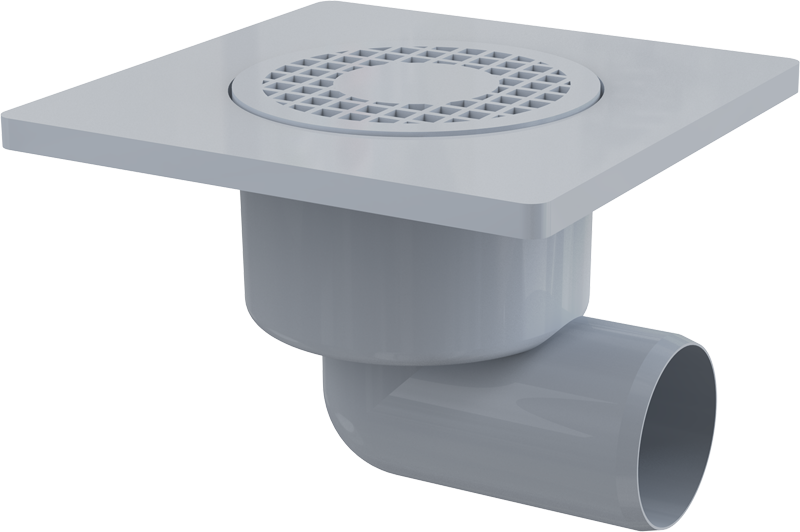 Корпус сливного трапа с боковым подключением к стоку Ø50 мм; Пластиковая решетка серая; Гидрозатвор – мокрый |
