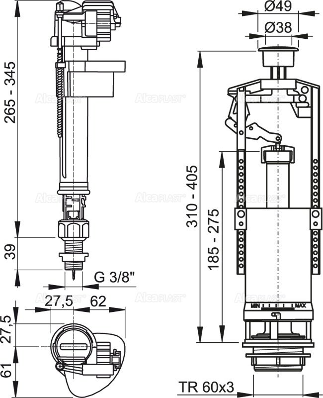 Конструкция позволяет регулировать высоту механизма в зависимости от высоты бачка.