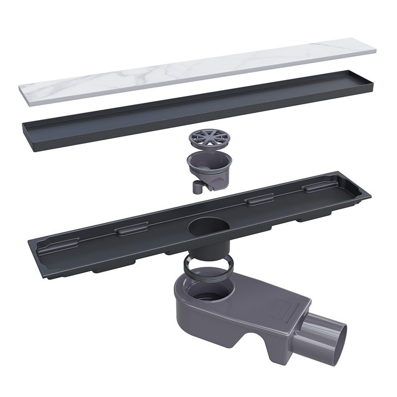 Универсальная сливная решетка доступна в черном цвете и позволяет укладку плитки, что обеспечивает гармоничное сочетание с вашим интерьером и стильный внешний вид. Линейная форма трапа обеспечивает современный стиль и легкость в уходе. В комплект также входит сифон.