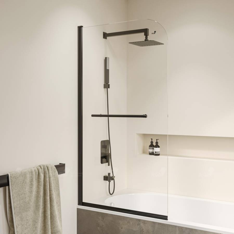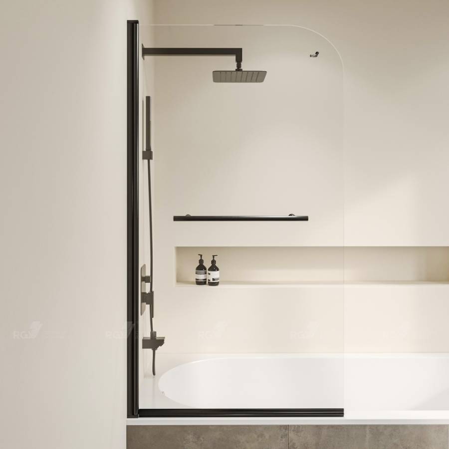 Цвет профиля шторки черный, что делает ее легкой в сочетании с любым цветовым решением ванной комнаты. Конструкция створки маятниковая, что позволяет открывать ее в двух направлениях - наружу и внутрь. Это удобно и практично для использования.