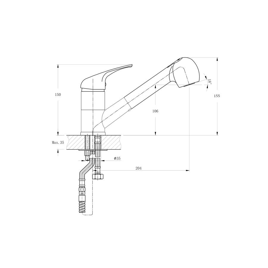 В смеситель установлен картридж D-40 (RSH202) с керамическими пластинами. Высота смесителя 155 мм. Излив вытяжной поворотный 360гр, 204мм. Высота излива до аэратора 106 мм. Аэратор изготовлен из пластика с нержавеющим корпусом, угол наклона аэратора- 18 гр.
