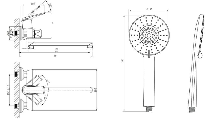 В комплекте универсальная присоединительная группа для установки на вертикальную поверхнгость, однорежимная душевая лейка и душевой шланг длиной 1,5м., держать душевой лейки, нержавеющие эксцентрики фум-лента, индивидуальный пакет, паспорт, гарантийный талон.