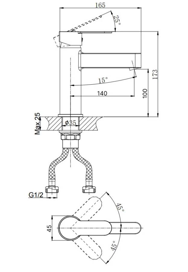 В смеситель установлен картридж D-35 с керамическими пластинами. Высота смесителя 173 мм. Излив литой неповоротный 130 мм. Высота излива до аэратора 97 мм. Аэратор изготовлен из пластика с нержавеющим корпусом, угол наклона - 15 гр.