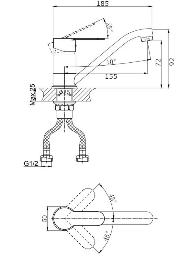 В смеситель установлен картридж D-35 с керамическими пластинами. Высота смесителя 122 мм. Излив поворотный 174 мм. Высота излива до аэратора 99 мм. Аэратор изготовлен из пластика с нержавеющим корпусом, угол наклона - 10 гр.