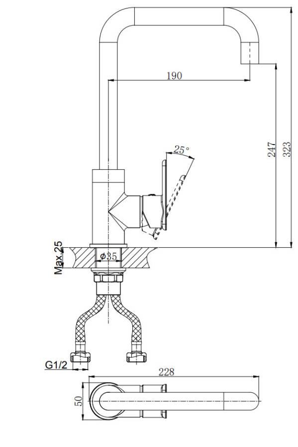 В смеситель установлен картридж D-35 с керамическими пластинами. Высота смесителя 323 мм. Излив поворотный 190 мм. Высота излива до аэратора 247 мм. Аэратор изготовлен из пластика с нержавеющим корпусом.
