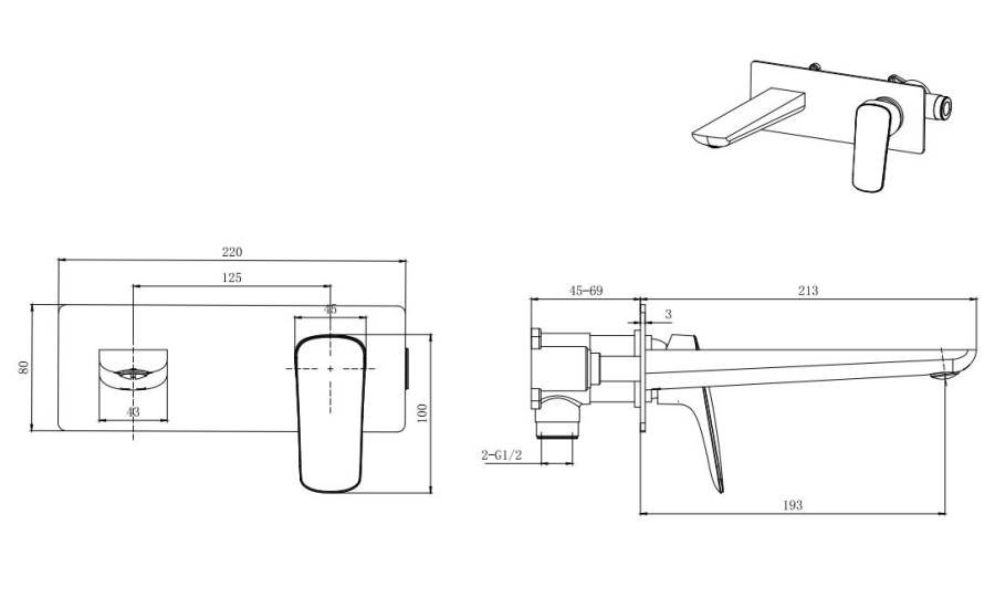 1. Смеситель (внешняя и скрытая часть) 2. Декоративная накладка на стену из нержавеющей стали 3. Излив смесителя |