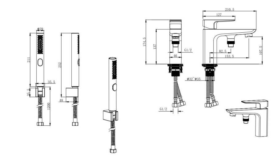 1. Смеситель 2. Гибкая подводка 50см 3. Шланг для лейки 150 см 4. Гигиеническая лейка, размер лейки 211*35,5 мм 5. Настенный держатель для ручной лейки |