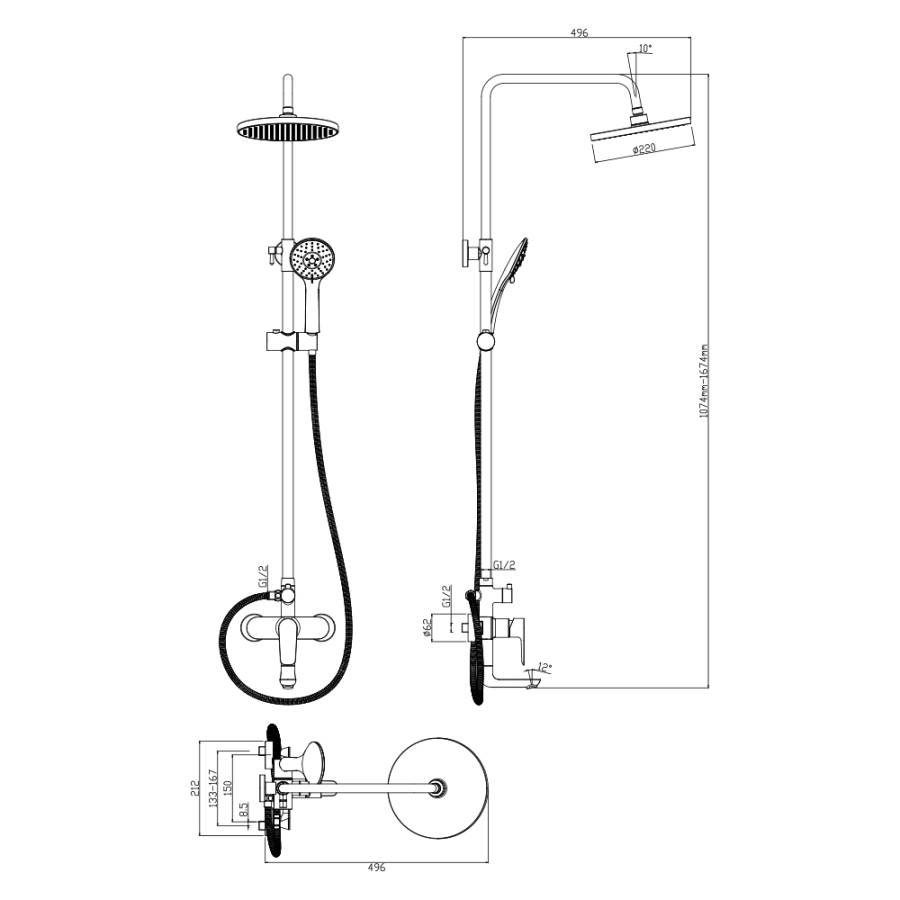 Регулируемая высота душевой стойки 114-170 см